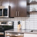The in-suite kitchen includes a full-size fridge, microwave, stove and dishwasher, with ample dishware and serving trays